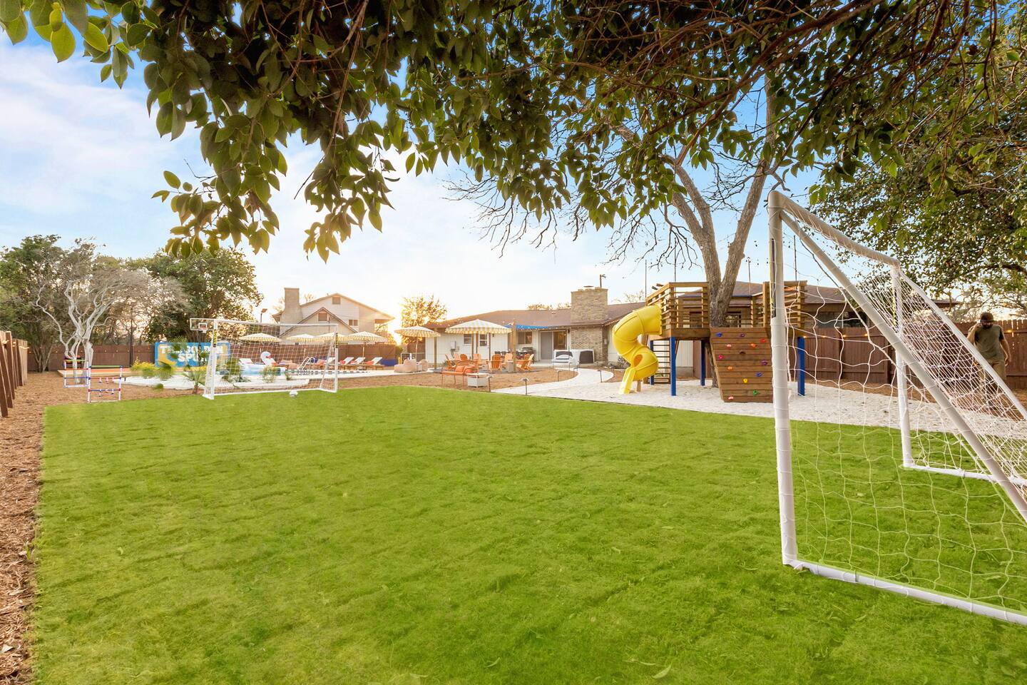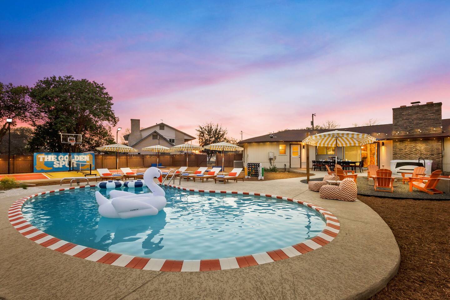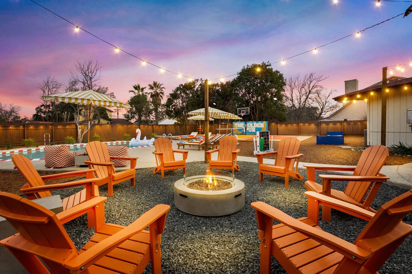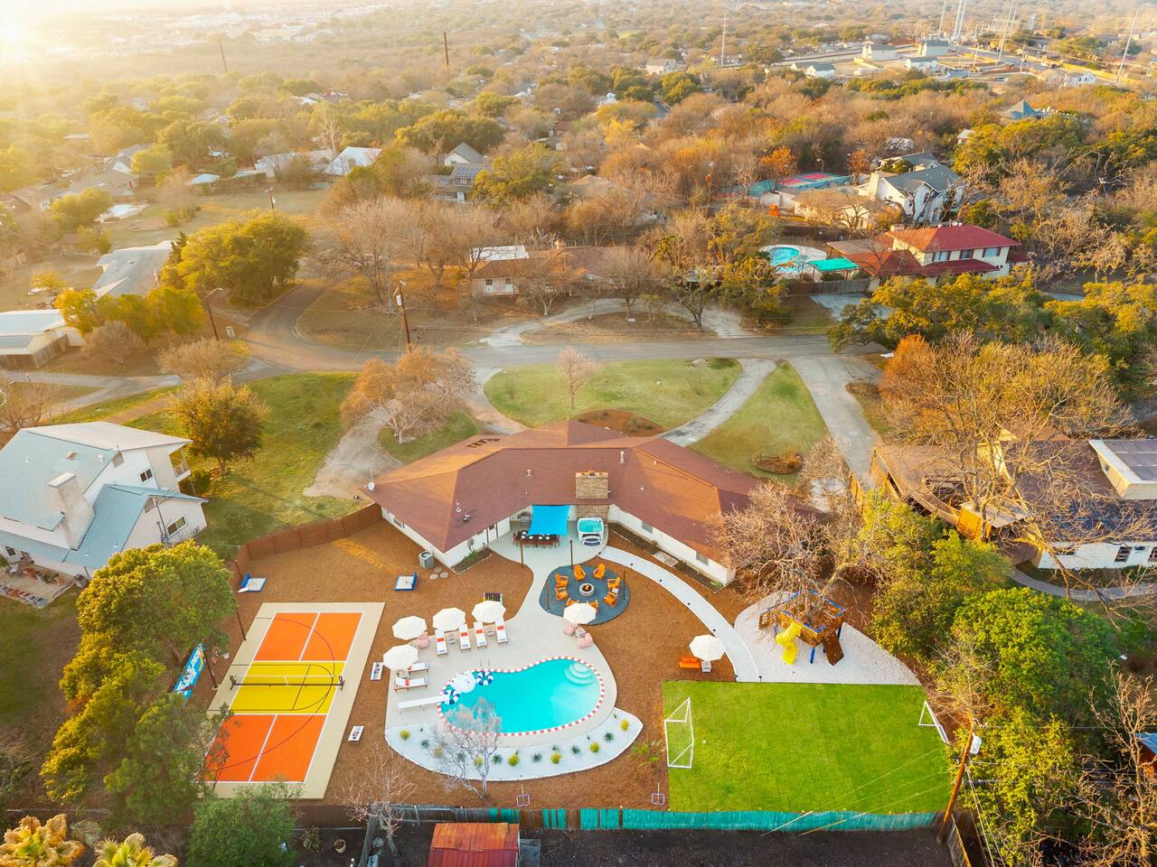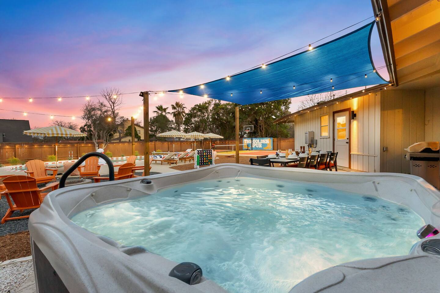 The Texas Time Machine welcomes you to a one-of-a-kind escape in beautiful San Antonio! This professionally designed home has been completely transformed into an retro oasis, perfect for families and groups of 16 or more guests! Outdoor with Everything: Step back in time but up in comfort! - One-of-a-kind kids soccer field with targets & balls for future World Cup stars - Tree house with climbing wall & slide - Take a dip in the 70's style large pool - Relax in the bubbling hot tub - Shoot hoops under the lights on a basketball court - Full Pickleball court to play during day or under the lights - Horseshoe pit - Cornhole - Life sized Connect 4 - Rope golf (ladder golf) and more. The fire pit creates the perfect ambiance for evening gatherings, plus the outdoor gas grill ♨️ and dining area is ideal for those al fresco meals. Indoor Entertainment: Step inside and enjoy a world of fun! Our movie theater room with 75" Smart TV is perfect for family movie nights with the most comfortable couches & fresh popcorn, while the game room boasts: - A pool table - Shuffleboard - Favorite arcade games: Golden Tee and Fast & Furious Street Fighter. - Spacious living room and communal areas for large groups and memory making! Luxury Accommodations: Four spacious 🛌 bedrooms provide ultimate comfort and the theatre features two queen raised bunk beds. All bedding from Quince is 100% organic cotton percale. A Pack-n-Play is stored for you in the hall closet with an 100% organic cotton sheet if you're bringing the little one 👶. All new furniture throughout the house designed to transport you to an experience, not feel like you're renting just another house. All bathrooms are fully stocked with Public Goods shampoo, conditioner, body wash, hand soap and lotion. Enjoy your slow mornings with freshly brewed coffee, tea, and even waffles made fresh with the provided waffle iron. Location, Location, Location: Located just minutes from top attractions, dining, and shopping, you’ll have easy access to everything San Antonio has to offer — from SeaWorld and Six Flags Fiesta Texas to Downtown San Antonio’s River Walk and The Alamo. Perfect for: Family vacations & group retreats. Your experience: We designed this home to deliver an exceptional guest experience. We have provided a fully equipped kitchen, and high speed Google wifi. Everything needed to have a great time is here, all that's missing is you! Guest access The space is all yours! This is a residential neighborhood. The backyard is very private and tons of fun. Registration Details: 2025-1296