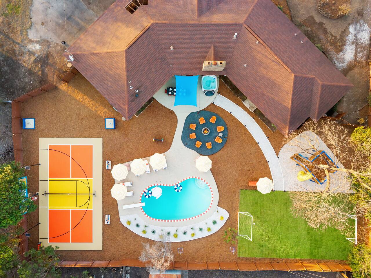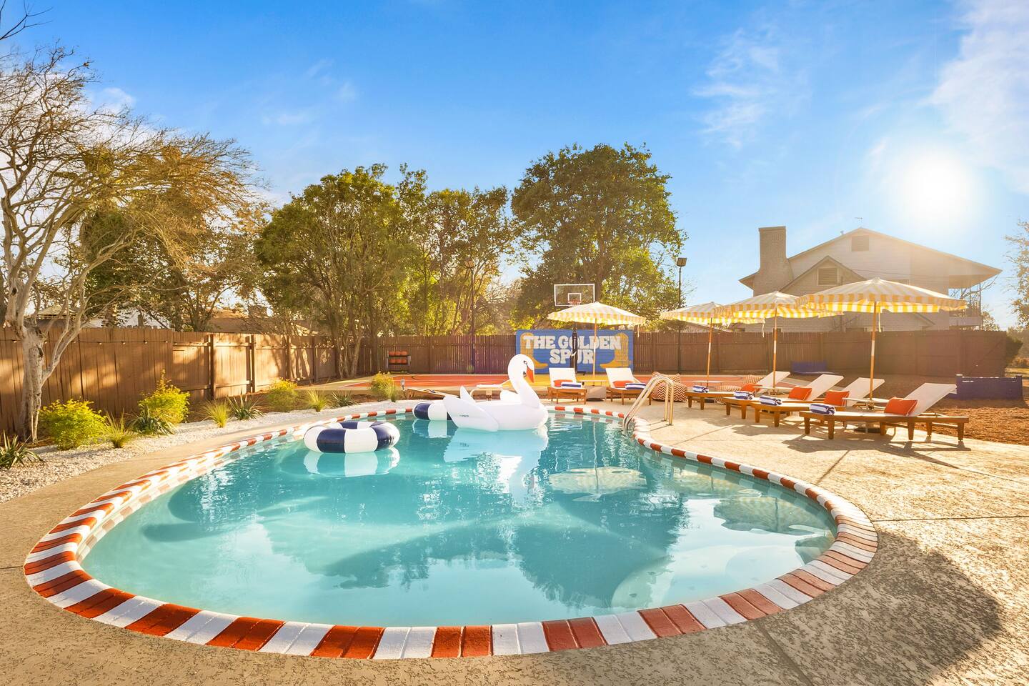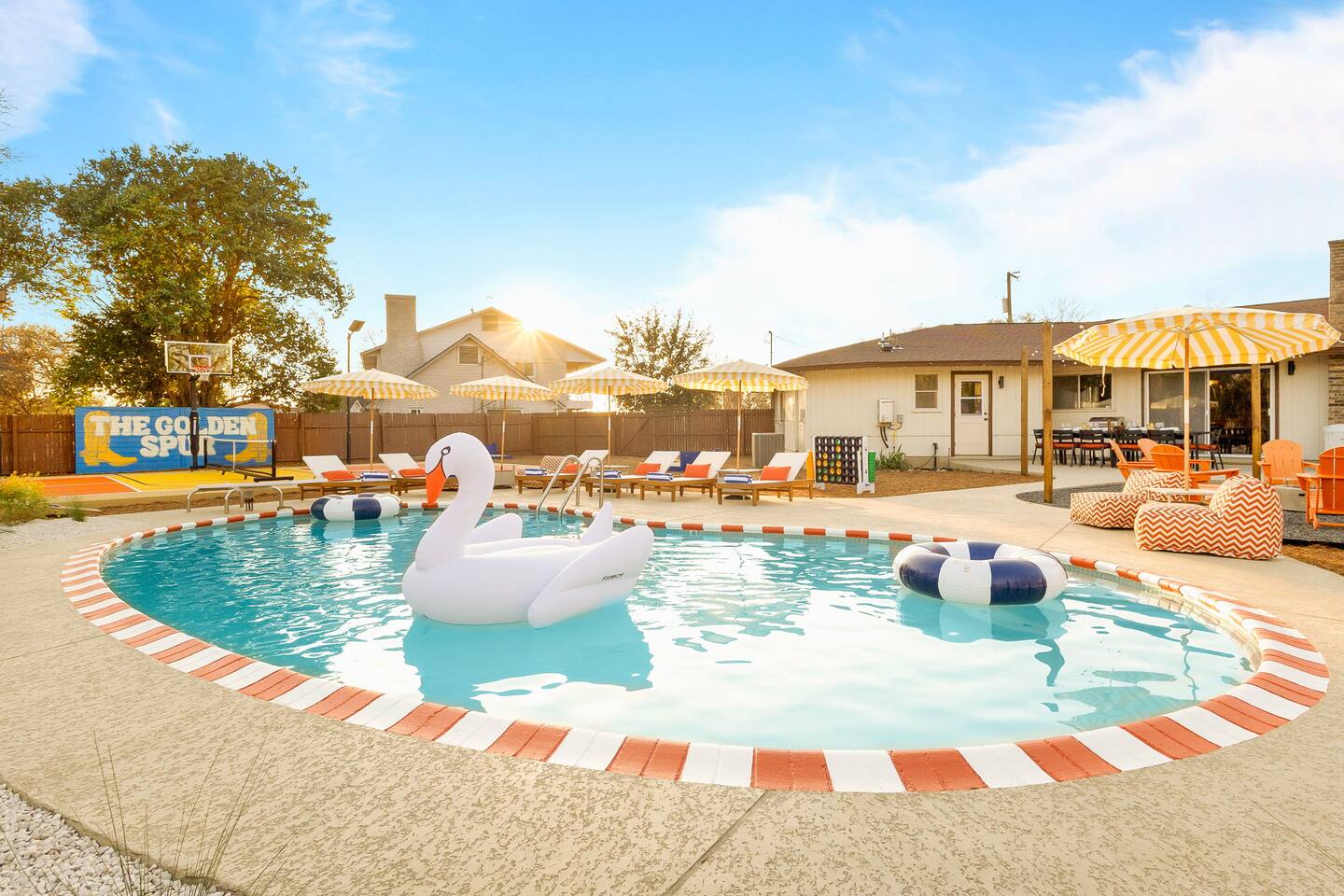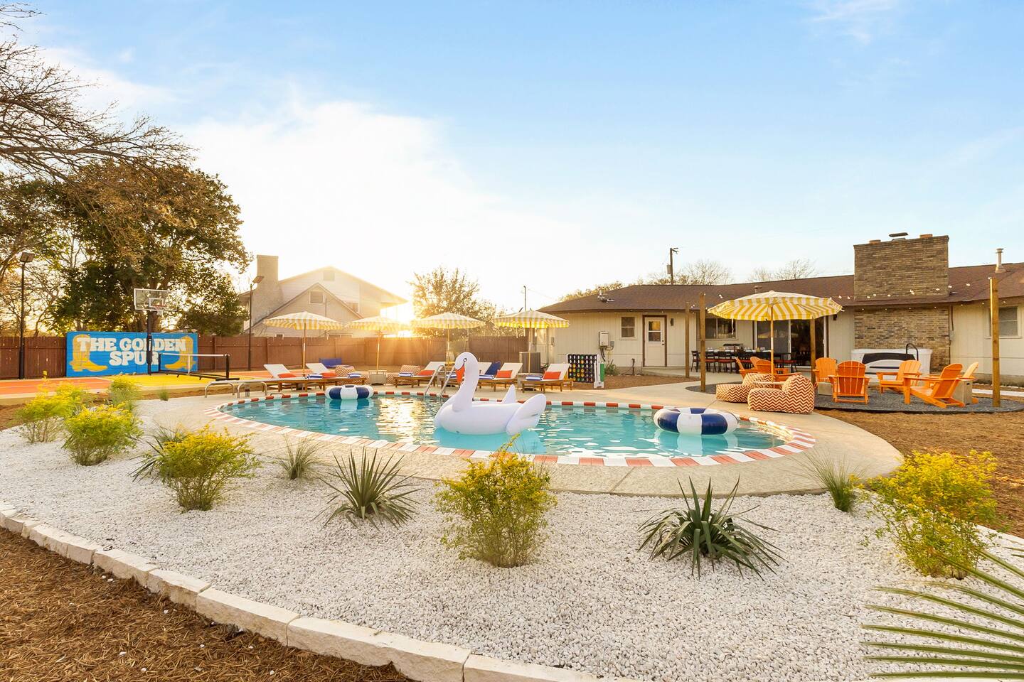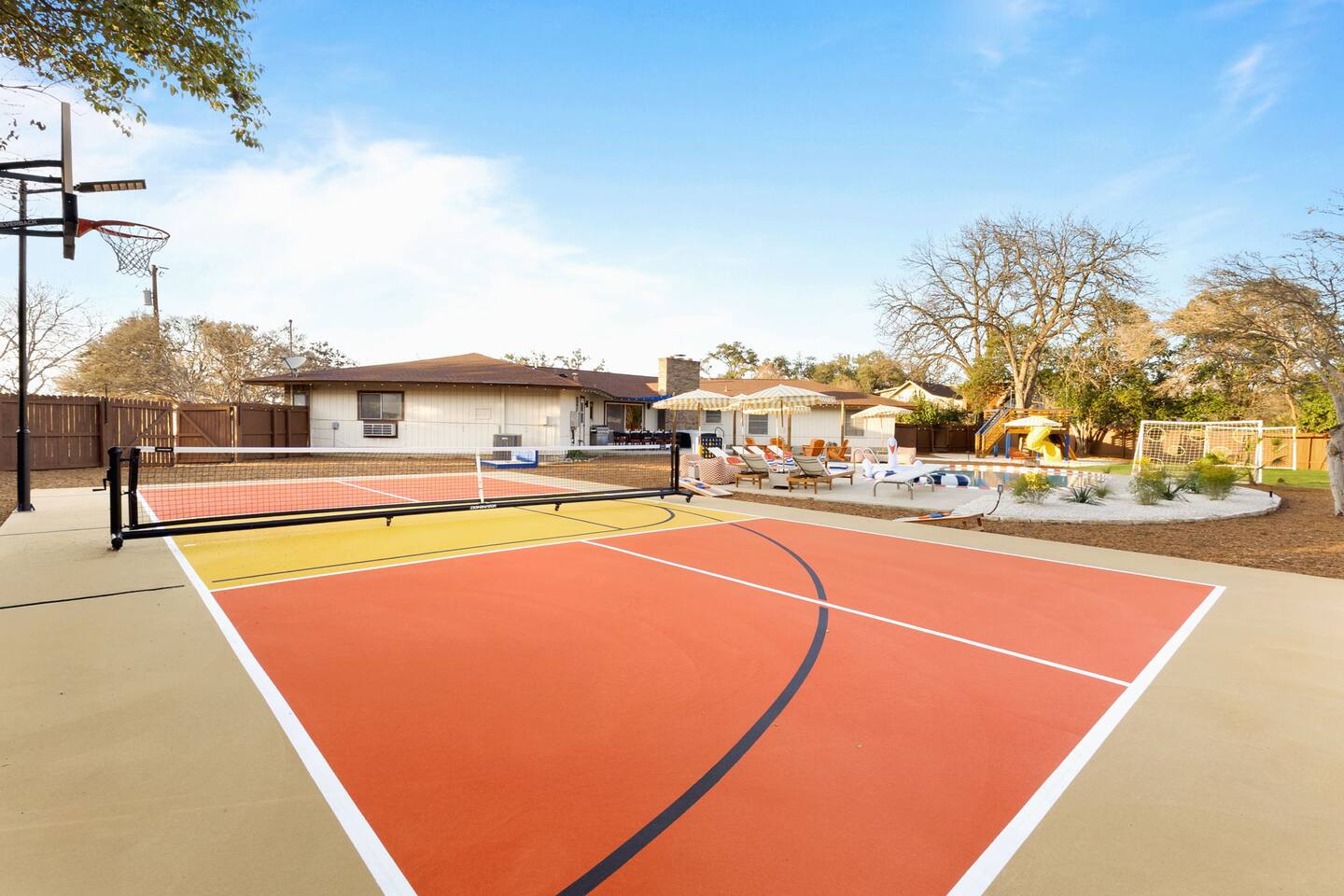 The Texas Time Machine welcomes you to a one-of-a-kind escape in beautiful San Antonio! This professionally designed home has been completely transformed into an retro oasis, perfect for families and groups of 16 or more guests! Outdoor with Everything: Step back in time but up in comfort! - One-of-a-kind kids soccer field with targets & balls for future World Cup stars - Tree house with climbing wall & slide - Take a dip in the 70's style large pool - Relax in the bubbling hot tub - Shoot hoops under the lights on a basketball court - Full Pickleball court to play during day or under the lights - Horseshoe pit - Cornhole - Life sized Connect 4 - Rope golf (ladder golf) and more. The fire pit creates the perfect ambiance for evening gatherings, plus the outdoor gas grill ♨️ and dining area is ideal for those al fresco meals. Indoor Entertainment: Step inside and enjoy a world of fun! Our movie theater room with 75" Smart TV is perfect for family movie nights with the most comfortable couches & fresh popcorn, while the game room boasts: - A pool table - Shuffleboard - Favorite arcade games: Golden Tee and Fast & Furious Street Fighter. - Spacious living room and communal areas for large groups and memory making! Luxury Accommodations: Four spacious 🛌 bedrooms provide ultimate comfort and the theatre features two queen raised bunk beds. All bedding from Quince is 100% organic cotton percale. A Pack-n-Play is stored for you in the hall closet with an 100% organic cotton sheet if you're bringing the little one 👶. All new furniture throughout the house designed to transport you to an experience, not feel like you're renting just another house. All bathrooms are fully stocked with Public Goods shampoo, conditioner, body wash, hand soap and lotion. Enjoy your slow mornings with freshly brewed coffee, tea, and even waffles made fresh with the provided waffle iron. Location, Location, Location: Located just minutes from top attractions, dining, and shopping, you’ll have easy access to everything San Antonio has to offer — from SeaWorld and Six Flags Fiesta Texas to Downtown San Antonio’s River Walk and The Alamo. Perfect for: Family vacations & group retreats. Your experience: We designed this home to deliver an exceptional guest experience. We have provided a fully equipped kitchen, and high speed Google wifi. Everything needed to have a great time is here, all that's missing is you! Guest access The space is all yours! This is a residential neighborhood. The backyard is very private and tons of fun. Registration Details: 2025-1296