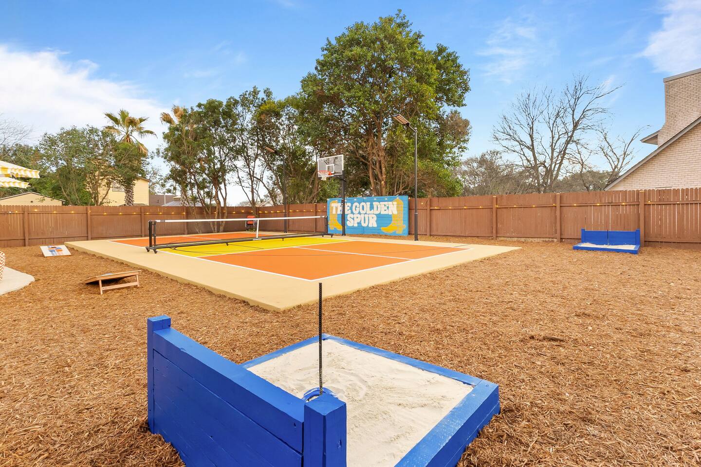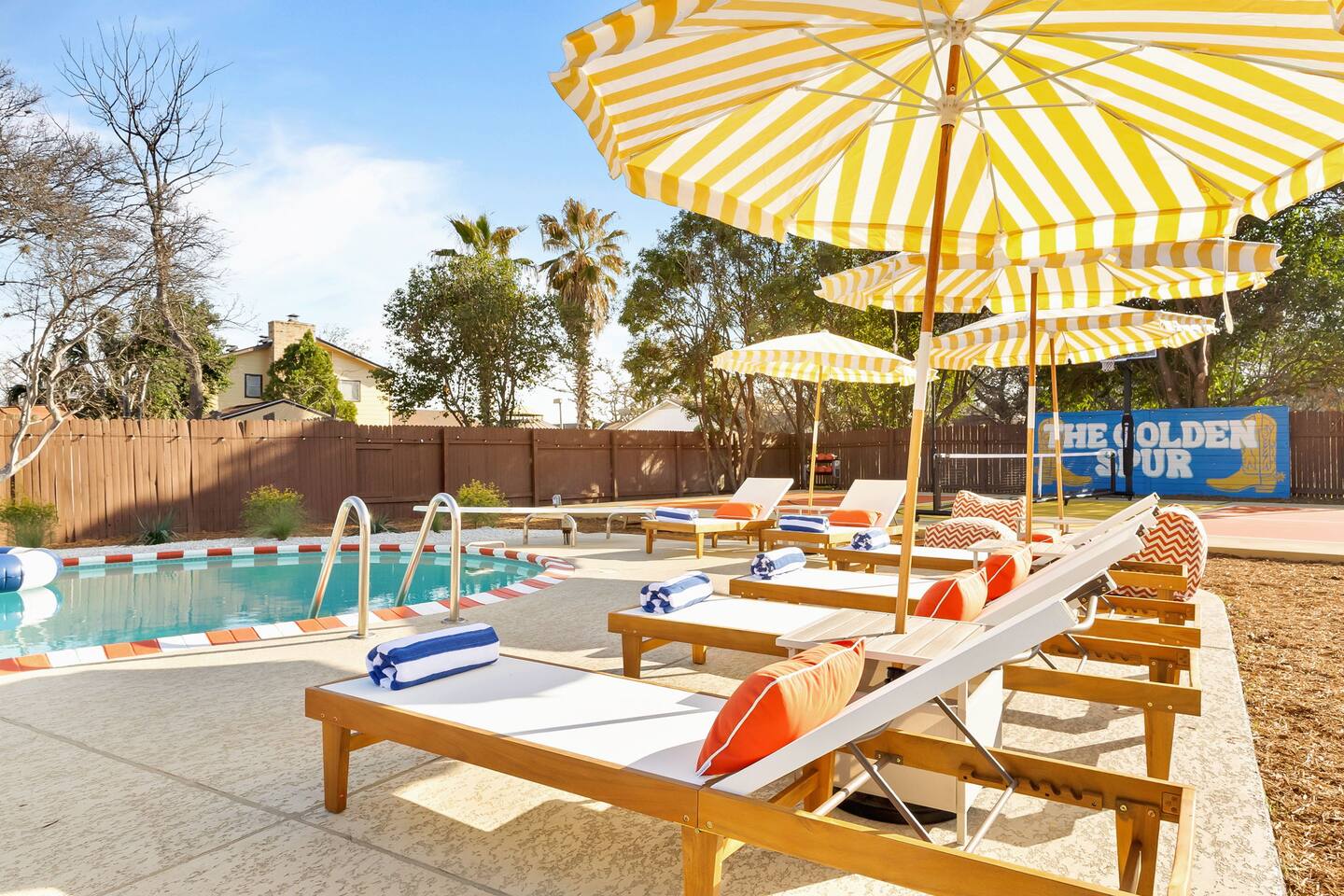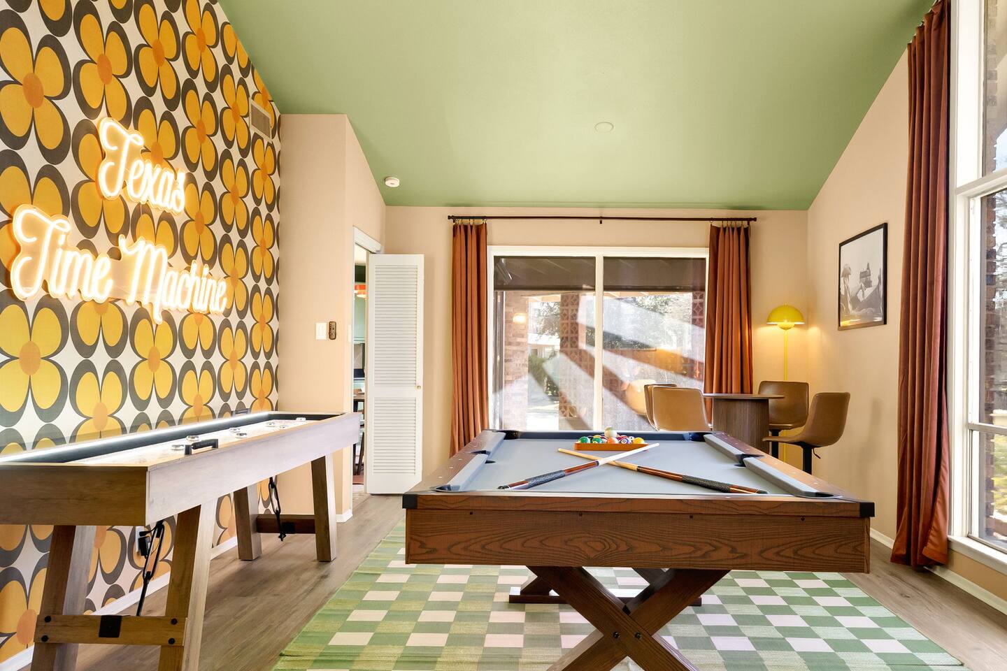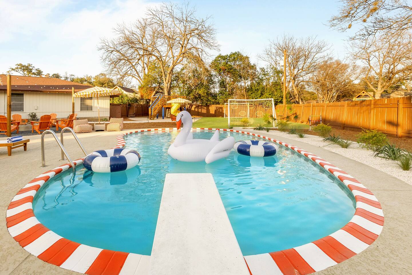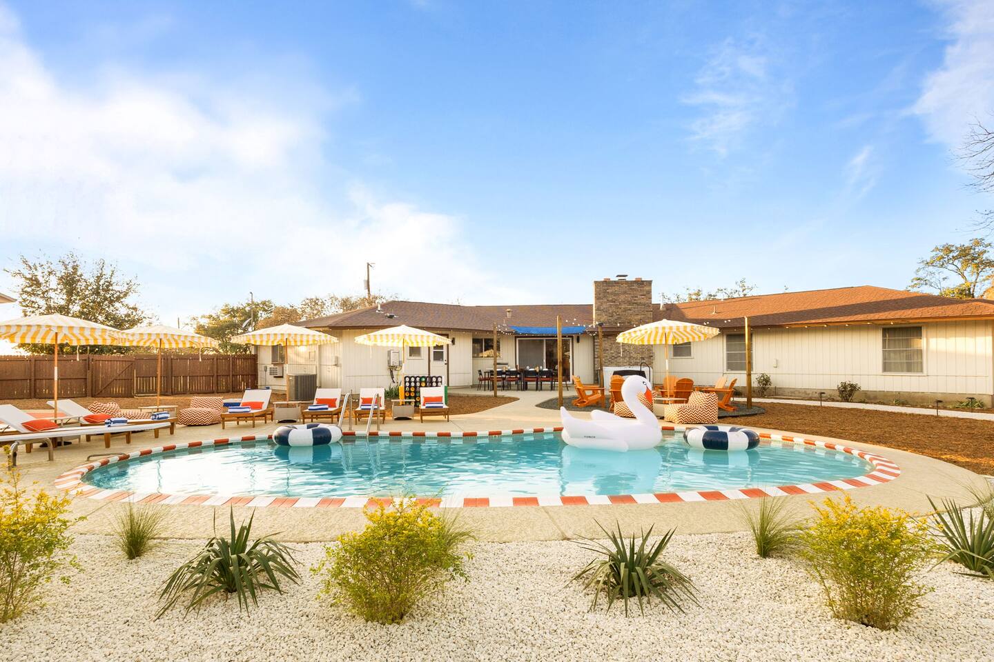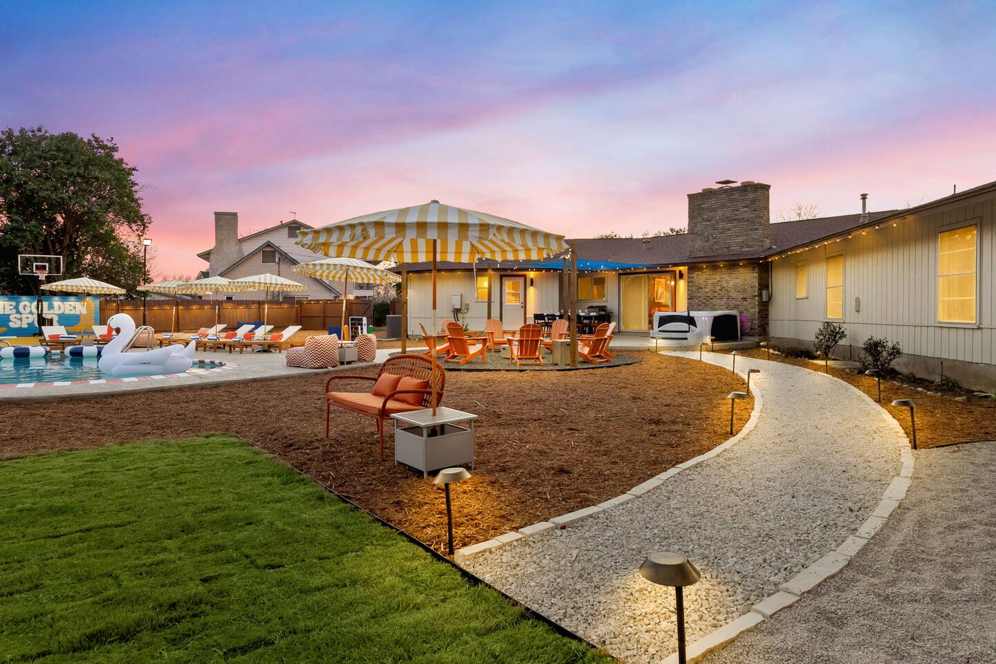 The Texas Time Machine welcomes you to a one-of-a-kind escape in beautiful San Antonio! This professionally designed home has been completely transformed into an retro oasis, perfect for families and groups of 16 or more guests! Outdoor with Everything: Step back in time but up in comfort! - One-of-a-kind kids soccer field with targets & balls for future World Cup stars - Tree house with climbing wall & slide - Take a dip in the 70's style large pool - Relax in the bubbling hot tub - Shoot hoops under the lights on a basketball court - Full Pickleball court to play during day or under the lights - Horseshoe pit - Cornhole - Life sized Connect 4 - Rope golf (ladder golf) and more. The fire pit creates the perfect ambiance for evening gatherings, plus the outdoor gas grill ♨️ and dining area is ideal for those al fresco meals. Indoor Entertainment: Step inside and enjoy a world of fun! Our movie theater room with 75" Smart TV is perfect for family movie nights with the most comfortable couches & fresh popcorn, while the game room boasts: - A pool table - Shuffleboard - Favorite arcade games: Golden Tee and Fast & Furious Street Fighter. - Spacious living room and communal areas for large groups and memory making! Luxury Accommodations: Four spacious 🛌 bedrooms provide ultimate comfort and the theatre features two queen raised bunk beds. All bedding from Quince is 100% organic cotton percale. A Pack-n-Play is stored for you in the hall closet with an 100% organic cotton sheet if you're bringing the little one 👶. All new furniture throughout the house designed to transport you to an experience, not feel like you're renting just another house. All bathrooms are fully stocked with Public Goods shampoo, conditioner, body wash, hand soap and lotion. Enjoy your slow mornings with freshly brewed coffee, tea, and even waffles made fresh with the provided waffle iron. Location, Location, Location: Located just minutes from top attractions, dining, and shopping, you’ll have easy access to everything San Antonio has to offer — from SeaWorld and Six Flags Fiesta Texas to Downtown San Antonio’s River Walk and The Alamo. Perfect for: Family vacations & group retreats. Your experience: We designed this home to deliver an exceptional guest experience. We have provided a fully equipped kitchen, and high speed Google wifi. Everything needed to have a great time is here, all that's missing is you! Guest access The space is all yours! This is a residential neighborhood. The backyard is very private and tons of fun. Registration Details: 2025-1296